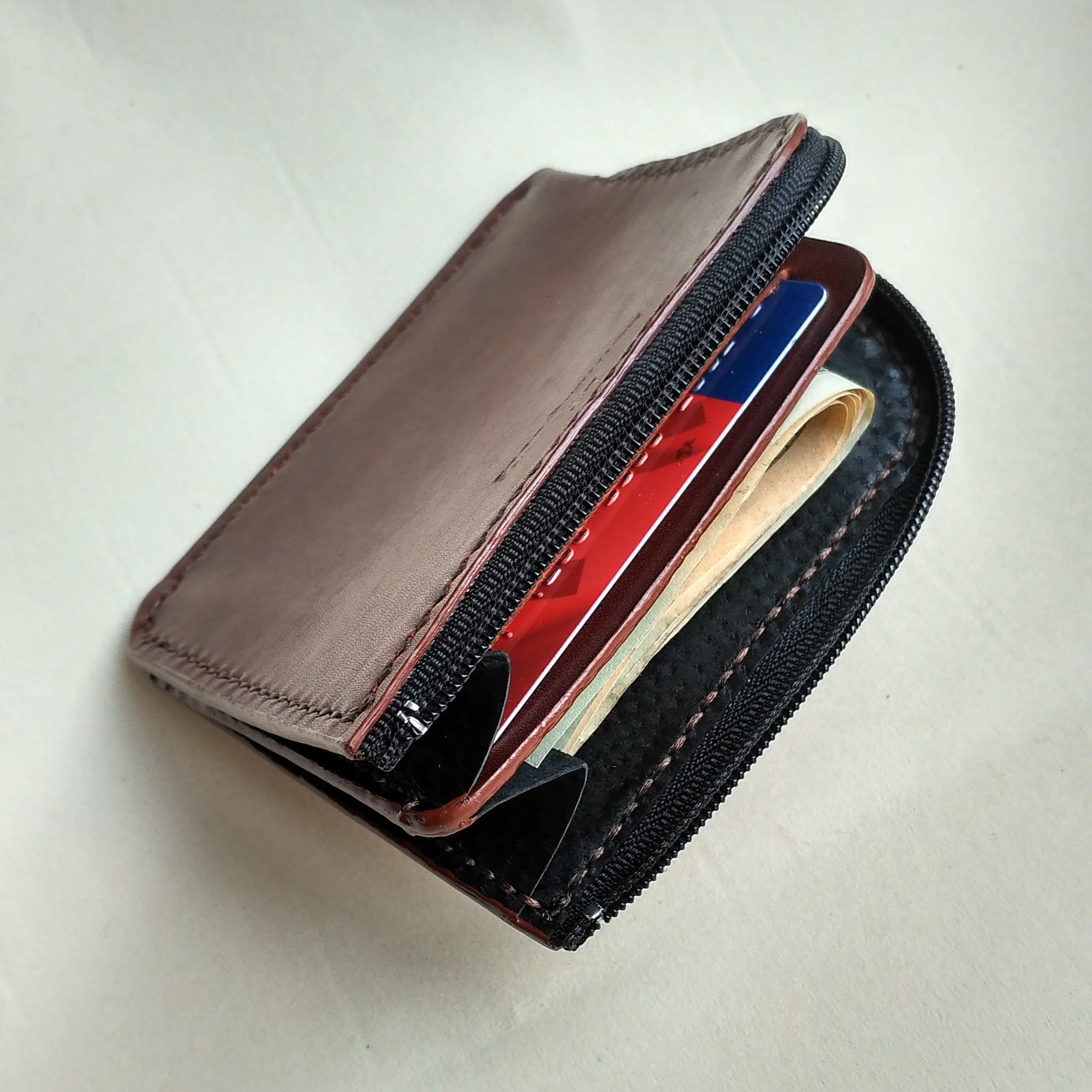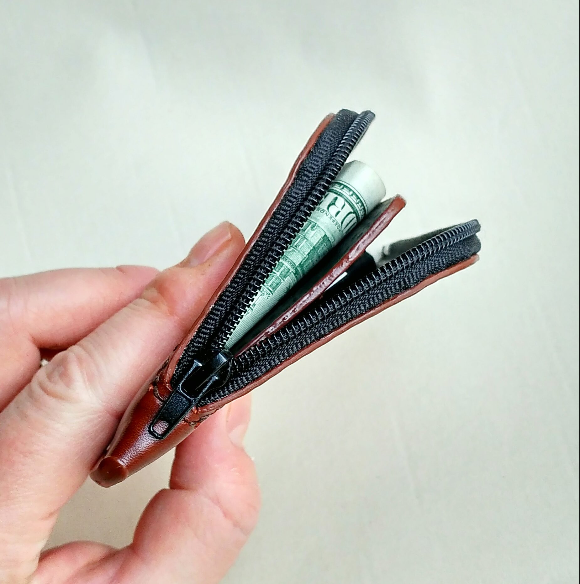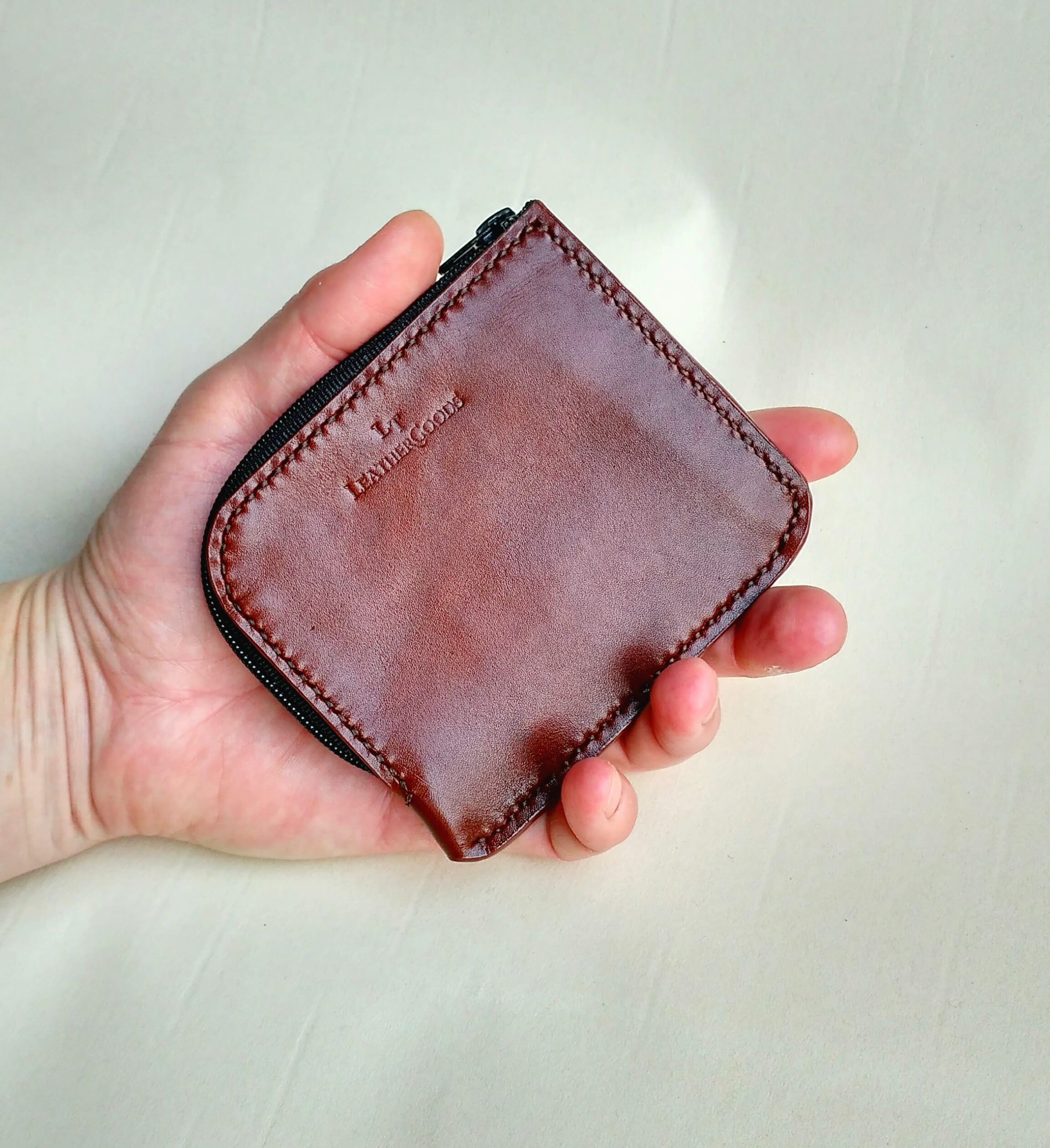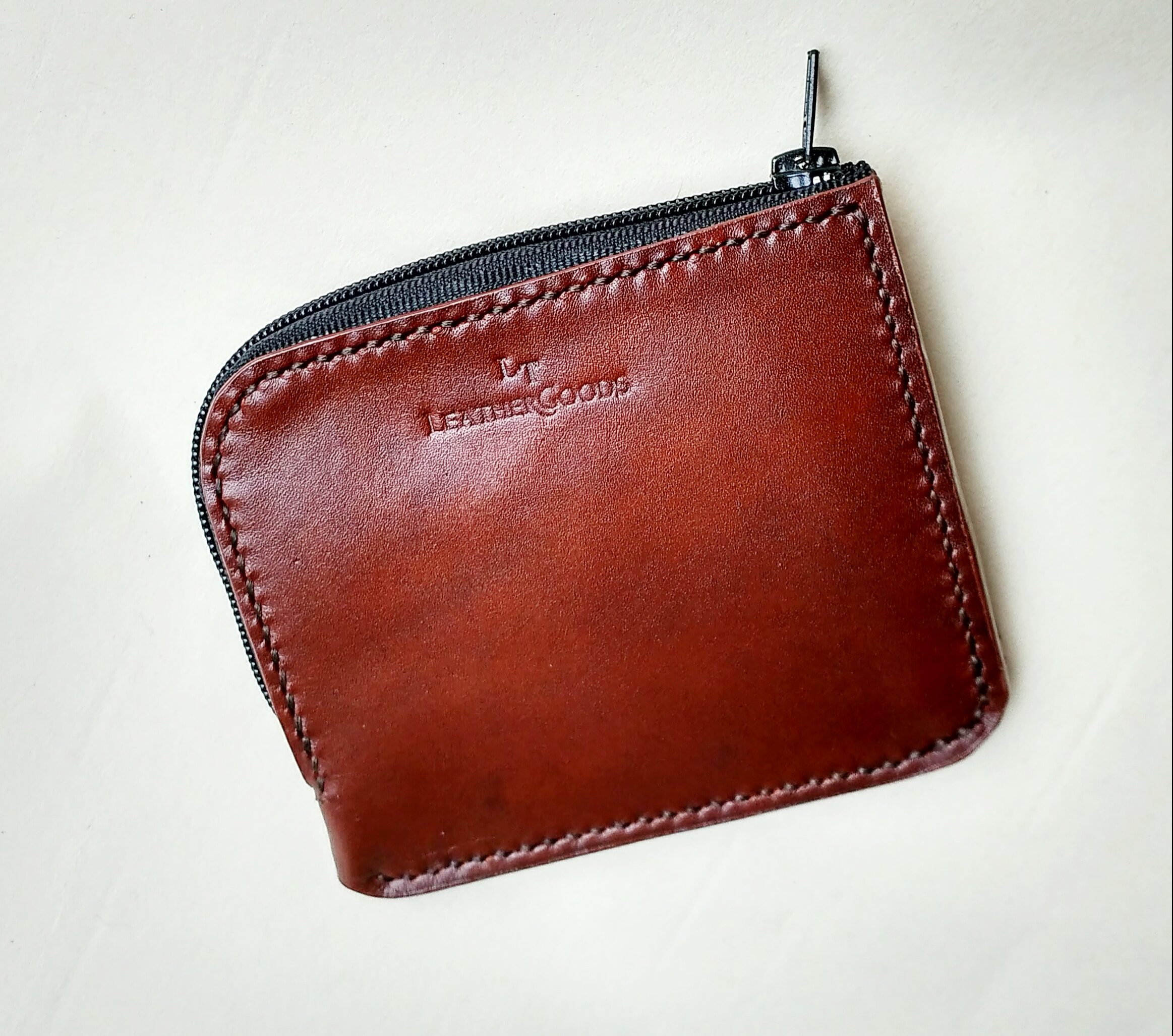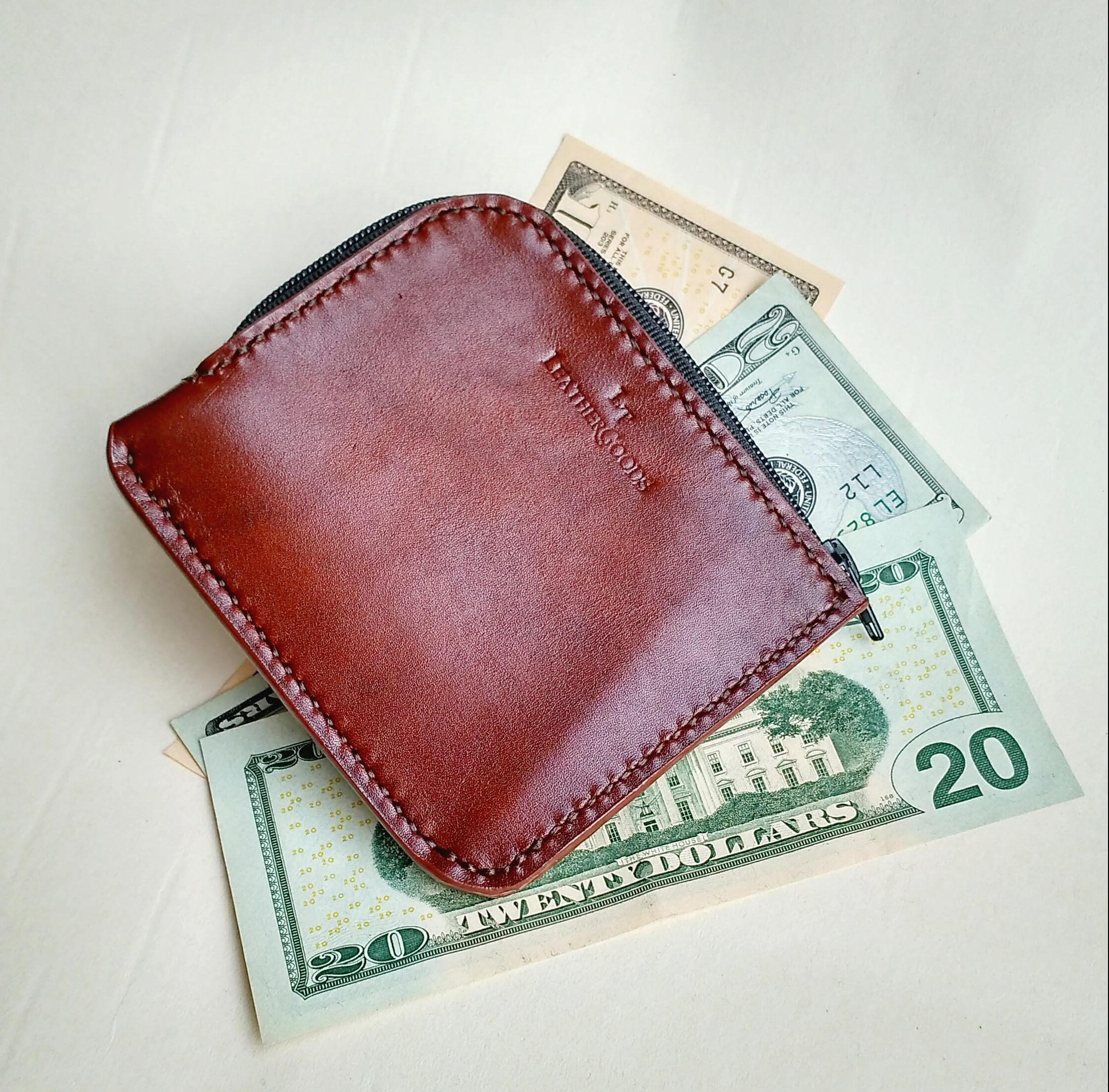 Идеальный кожаный аксессуар на молнии. Стильный молодежный дизайн исполнения. Изготовлен полностью вручную из кожи крупного рогатого скота. Изделие полностью проклеено и прошито седельным швов прочной вощенной нитью.  Кошелек обработан специальным эликсиром, предающим легкий матовый блеск. Все торцы полностью отполированы и покрыты специальной краской. Есть возможность нанесения рисунка или инициалов с помощью выжигателя.